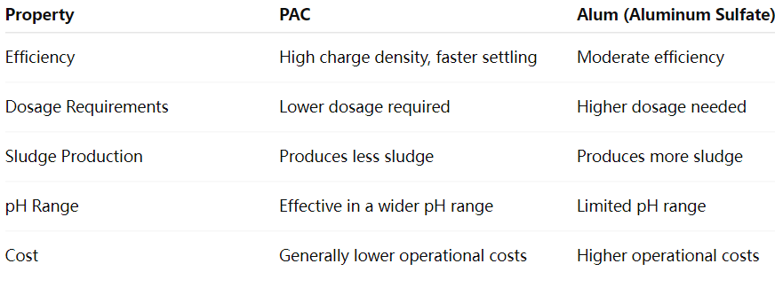 Na rozdiel od tradičných koagulantov, ako je kamenec (síran hliník), je PAC známy svojou vynikajúcou účinnosťou a rýchlejším časom usadenia v procesoch úpravy vody. Má vysokú hustotu náboja, vďaka čomu je obzvlášť účinná pri destabilizácii suspendovaných častíc a vytváraní väčších vločiek, ktoré sa potom môžu odstrániť sedimentáciou alebo filtráciou.